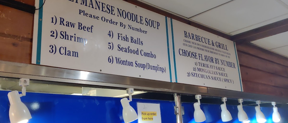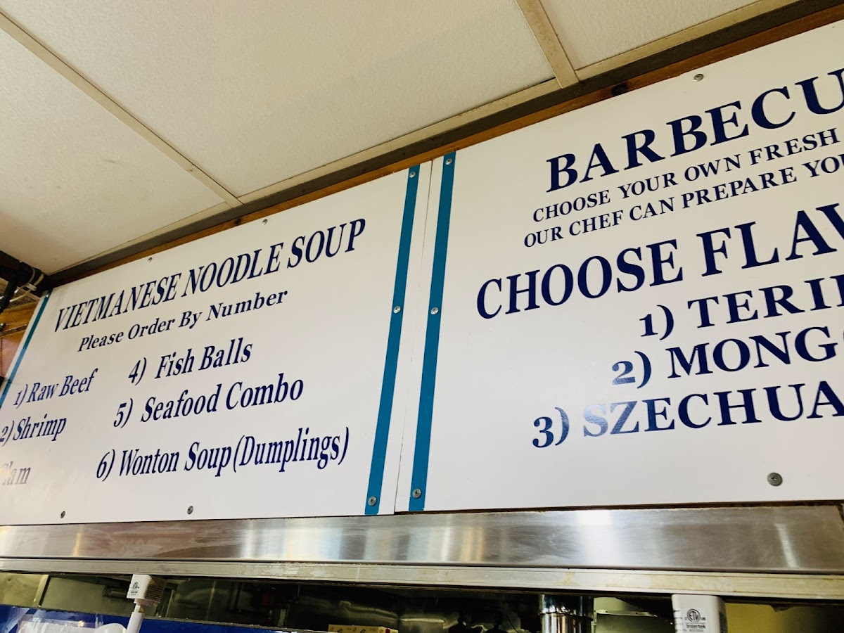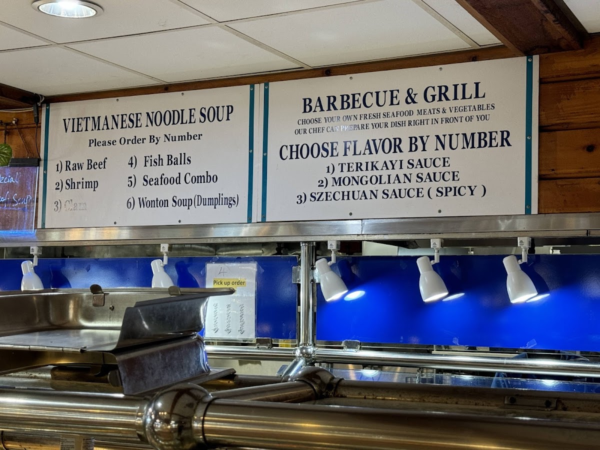 Several soup options are available, including beef noodle soup, wonton noodle soup, and other varieties that can be customized. Main dishes include chicken lo mein and a selection of meat and seafood plates such as shrimp and chicken combinations and spicy crawfish.